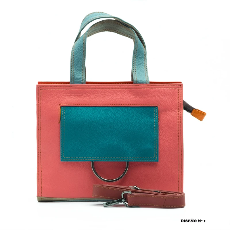 Bolso mediano de piel legítima multicolor, con diseño moderno y muy funcional. Se puede llevar con asas cortas o asa bandolera desmontable mediante mosquetones. Interior forrado con dos bolsillos, uno con cremallera. En el exterior, cuenta con bolsillo con solapa decorado con aro metálico y cierre de clip. Un bolso práctico, original y versátil para el día a día.